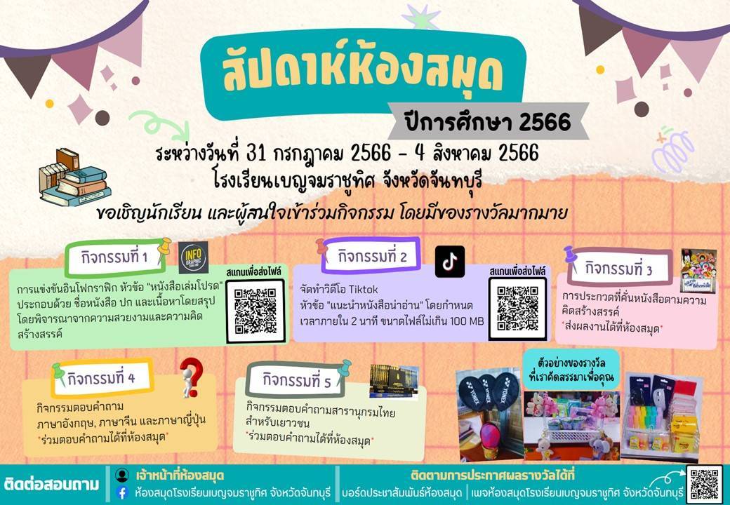 ขอเชิญนักเรียน และผู้สนใจเข้าร่วมกิจกรรมสัปดาห์ห้องสมุด โรงเรียนเบญจมราชูทิศ จังหวัดจันทบุรี
