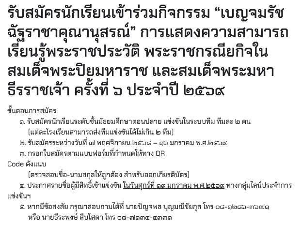 รับสมัครนักเรียนเข้าร่วมการแสดงความสามารถเรียนรู้ พระราชประวัติ พระราชกรณียกิจในสมเด็จพระปิยมหาราชและสมเด็จพระมหาธีรราชเจ้า ครั้งที่ ๖ ประจำปี ๒๕๖๙ วันเสาร์ที่ ๒๔ มกราคม ๒๕๖๙ 10 / พ.ย. / 2568