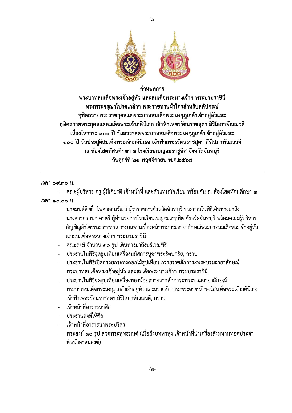 กำหนดการพิธีอุทิศถวายพระราชกุศลแด่พระบาทสมเด็จพระมงกุฎเกล้าเจ้าอยู่หัวและอุทิศถวายพระกุศลแด่สมเด็จพระเจ้าภคินีเธอ เจ้าฟ้าเพชรรัตนราชสุดา สิริโสภาพัณณวดี เนื่องในวาระ ๑๐๐ ปี