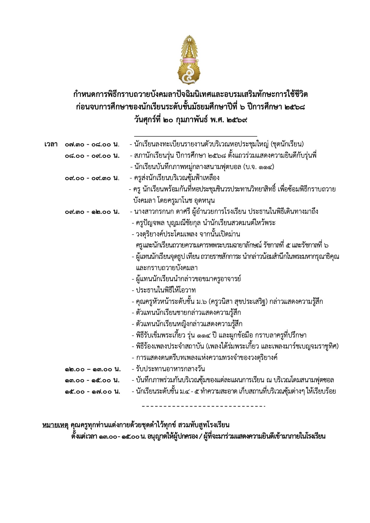 กําหนดการพิธีกราบถวายบังคมลา ปัจฉิมนิเทศ และอบรมเสริมทักษะการใช้ชีวิตก่อนจบการศึกษาของนักเรียนระดับชั้นมัธยมศึกษาปีที่ ๖ ปีการศึกษา ๒๕๖๘ วันศุกร์ที่ ๒๐ กุมภาพันธ์ พ.ศ. ๒๕๖๙
