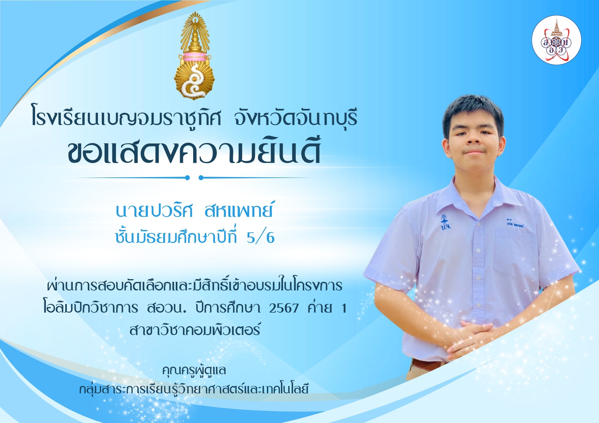 ผ่านการสอบคัดเลือกและมีสิทธิ์เข้าอบรมในโครงการโอลิมปิกวิชาการ สอวน. ปีการศึกษา 2567 ค่าย 1 สาขาวิชาคอมพิวเตอร์