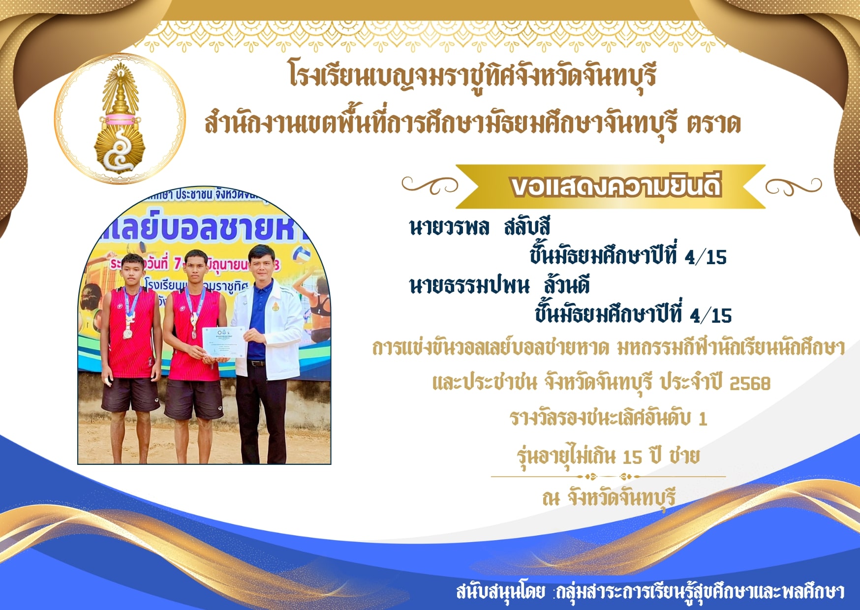 รางวัลชนะเลิศ การแข่งขันวอลเลย์บอลชายหาด มหกรรมกีฬานักเรียนนักศึกษา และประชาชน จังหวัดจันทบุรี ประจำปี 2568