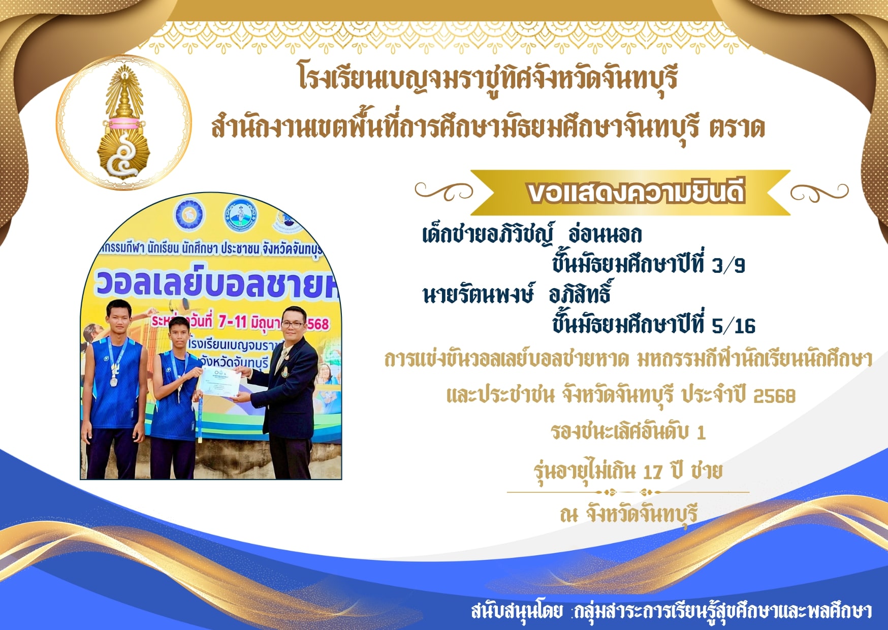 รางวัลรองชนะเลิศอันดับ 1 รุ่นอายุไม่เกิน 17 ปี ชาย การแข่งขันวอลเลย์บอลชายหาด มหกรรมกีฬานักเรียนนักศึกษา และประชาชน จังหวัดจันทบุรี ประจำปี 2568
