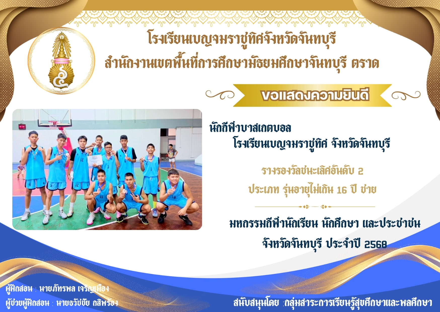 รางวัลรองชนะเลิศอันดับ 2 ประเภท รุ่นอายุไม่เกิน 16 ปี ชาย มหกรรมกีฬานักเรียน นักศึกษา และประชาชน จังหวัดจันทบุรี ประจำปี 2568