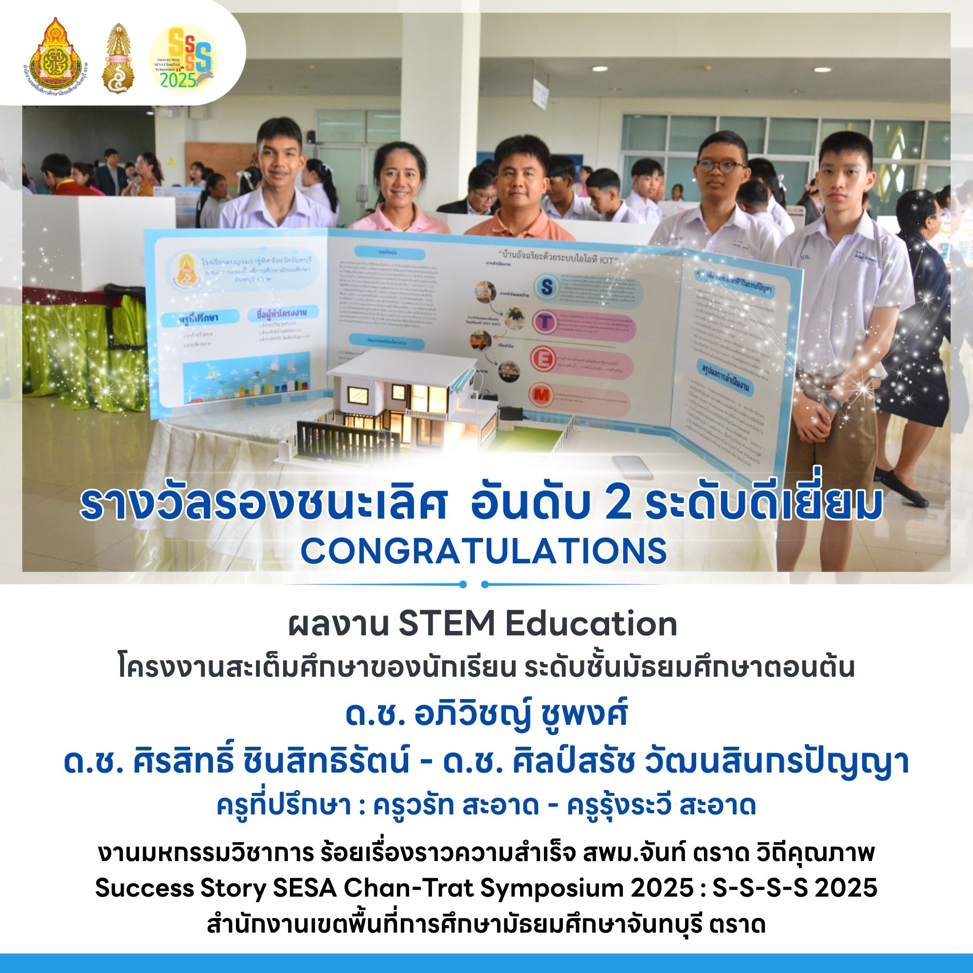 รางวัลรองชนะเลิศ อันดับ 2 ระดับดีเยี่ยม ผลงาน STEM Education โครงงานสะเต็มศึกษาของนักเรียน ระดับชั้นมัธยมศึกษาตอนต้น งานมหกรรมวิชาการ ร้อยเรื่องราวความสำเร็จ สพม.จันท์ ตราด วิถีคุณภาพ Success Story SESA Chan-Trat Symposium 2025 : S-S-S-S 2025 สำนักงานเข