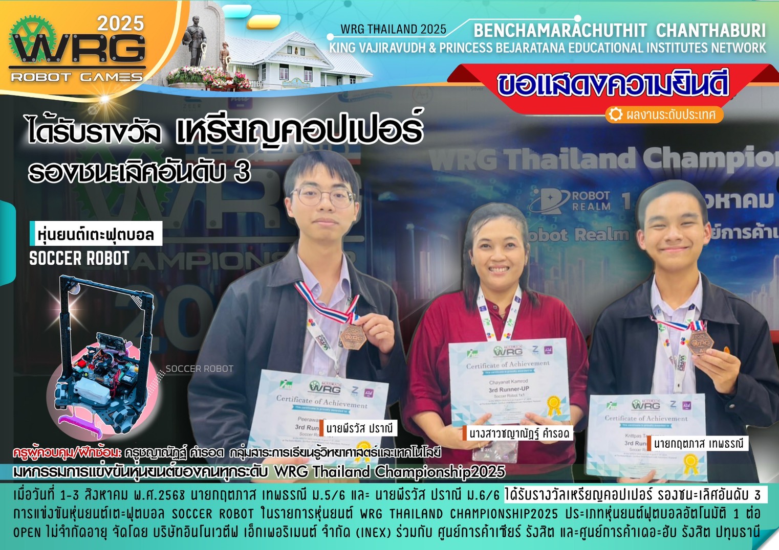 รางวัลเหรียญคอปเปอร์ (Copper Medal) รองชนะเลิศอันดับ 3 ประเภท: หุ่นยนต์เตะฟุตบอล (Soccer Robot) มหกรรมการแข่งขันหุ่นยนต์ของคนทุกระดับ WRG Thailand Championship 2025