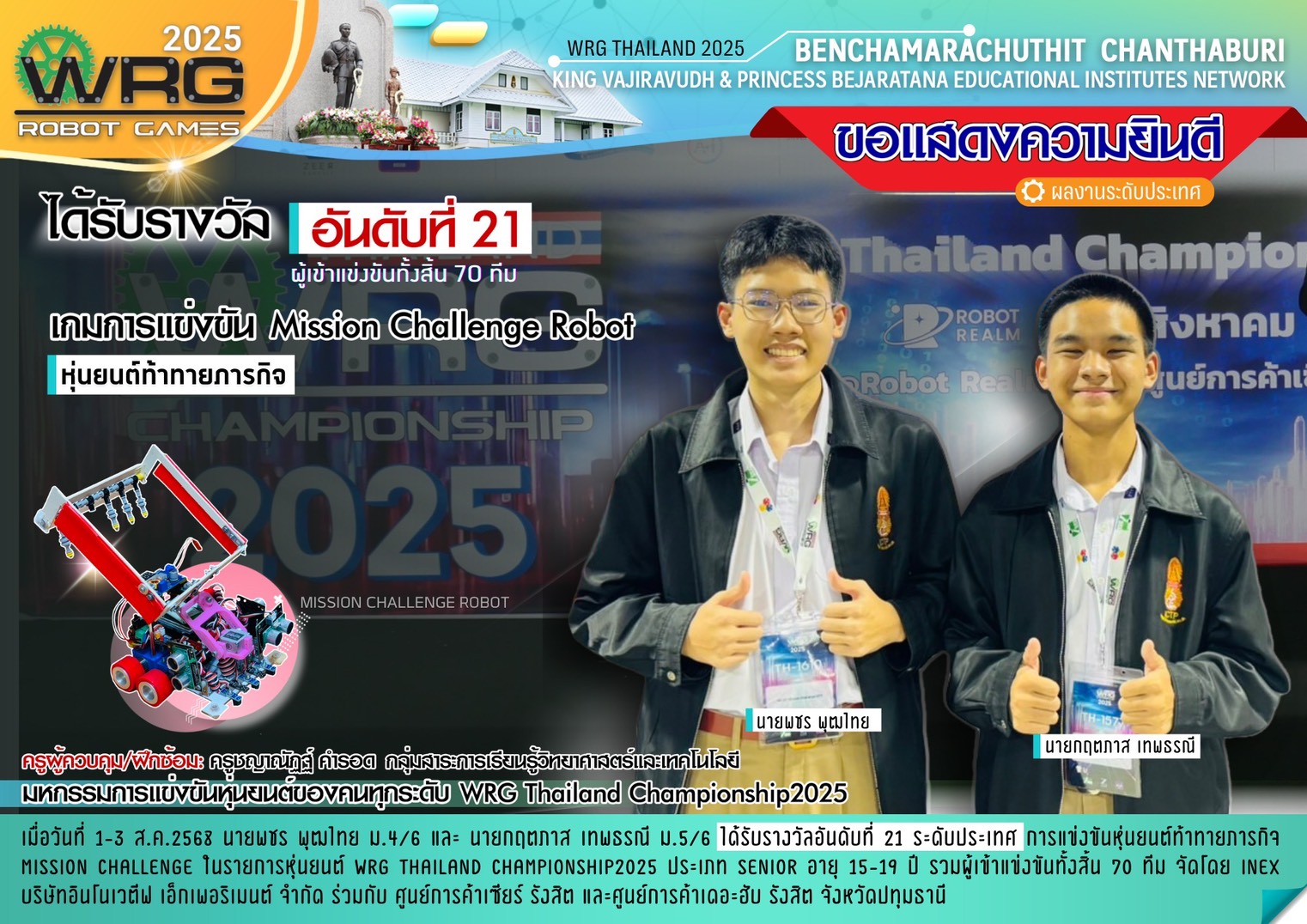 รางวัลอันดับที่ 21 ระดับประเทศ (จากผู้เข้าแข่งขันทั้งสิ้น 70 ทีม) ประเภท: หุ่นยนต์ท้าทายภารกิจ (Mission Challenge Robot) มหกรรมการแข่งขันหุ่นยนต์ของคนทุกระดับ WRG Thailand Championship 2025