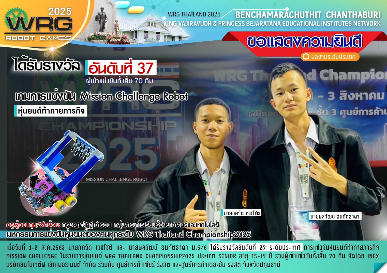 รางวัลอันดับที่ 37 ระดับประเทศ (จากผู้เข้าแข่งขันทั้งสิ้น 70 ทีม) ประเภท: หุ่นยนต์ท้าทายภารกิจ (Mission Challenge Robot) มหกรรมการแข่งขันหุ่นยนต์ของคนทุกระดับ WRG Thailand Championship 2025