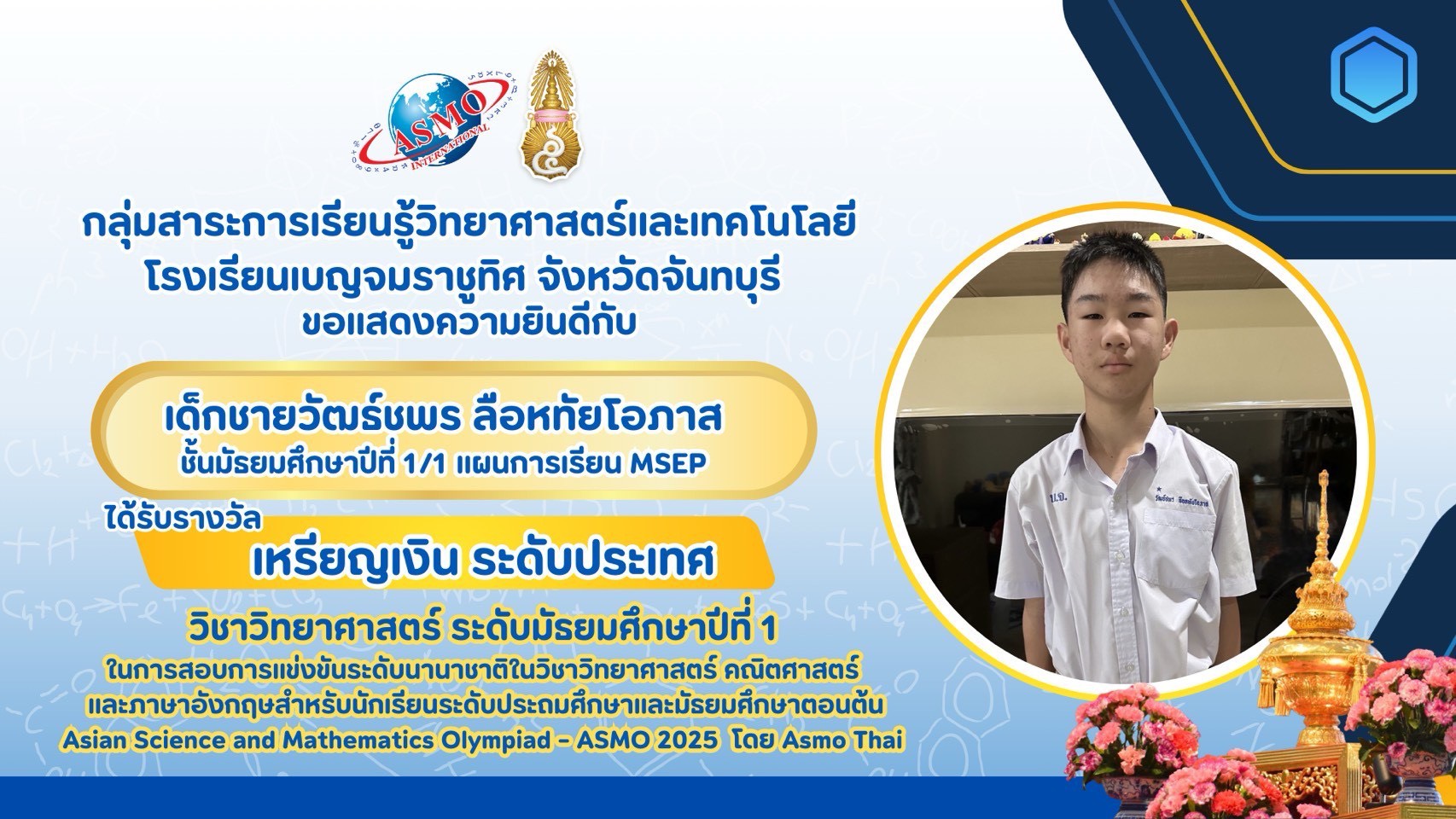 รางวัลเหรียญเงิน ระดับประเทศ (Silver Medal, National Level) การสอบแข่งขันวิชาการนานาชาติวิชาวิทยาศาสตร์ คณิตศาสตร์ และภาษาอังกฤษสำหรับนักเรียนระดับประถมศึกษาและมัธยมศึกษาตอนต้น (Asian Science and Mathematics Olympiad - ASMO 2025 โดย ASMO Thai)