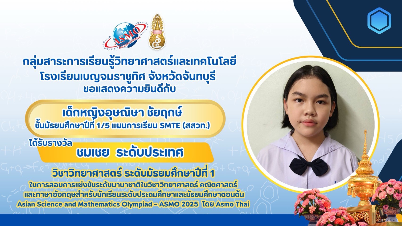 รางวัลชมเชย ระดับประเทศ (Commendation/Honorable Mention, National Level) การสอบแข่งขันวิชาการนานาชาติวิชาวิทยาศาสตร์ คณิตศาสตร์ และภาษาอังกฤษสำหรับนักเรียนระดับประถมศึกษาและมัธยมศึกษาตอนต้น (Asian Science and Mathematics Olympiad - ASMO 2025 โดย ASMO Thai