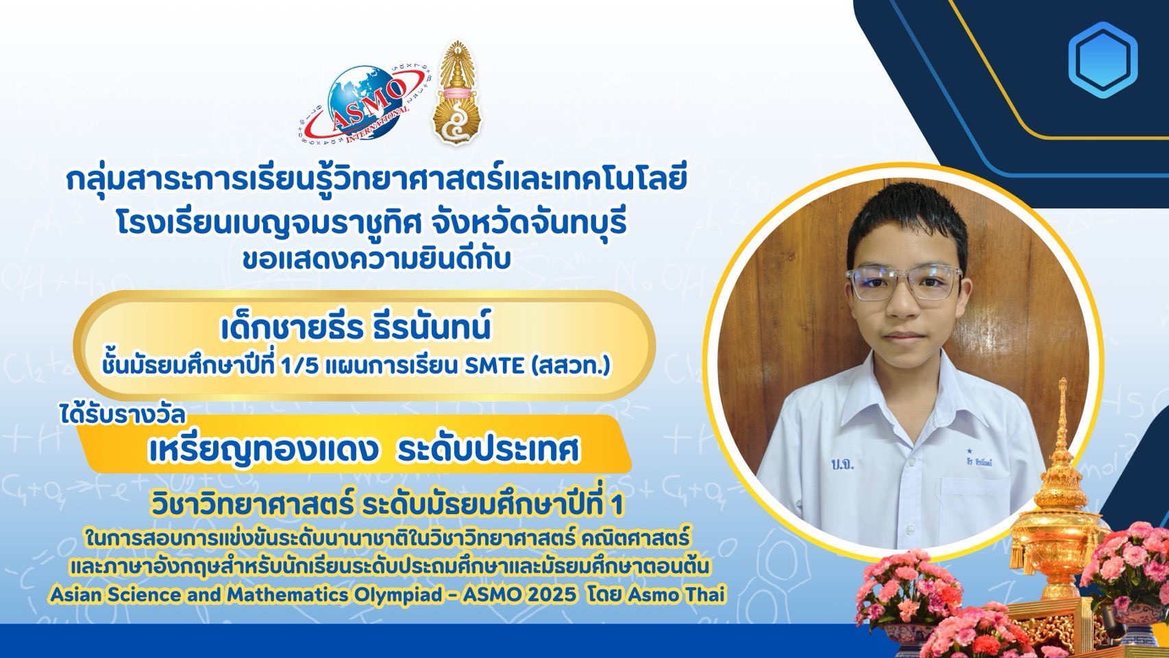 รางวัลเหรียญทองแดง ระดับประเทศ (Bronze Medal, National Level) การสอบแข่งขันวิชาการนานาชาติวิชาวิทยาศาสตร์ คณิตศาสตร์ และภาษาอังกฤษสำหรับนักเรียนระดับประถมศึกษาและมัธยมศึกษาตอนต้น (Asian Science and Mathematics Olympiad - ASMO 2025 โดย ASMO Thai)