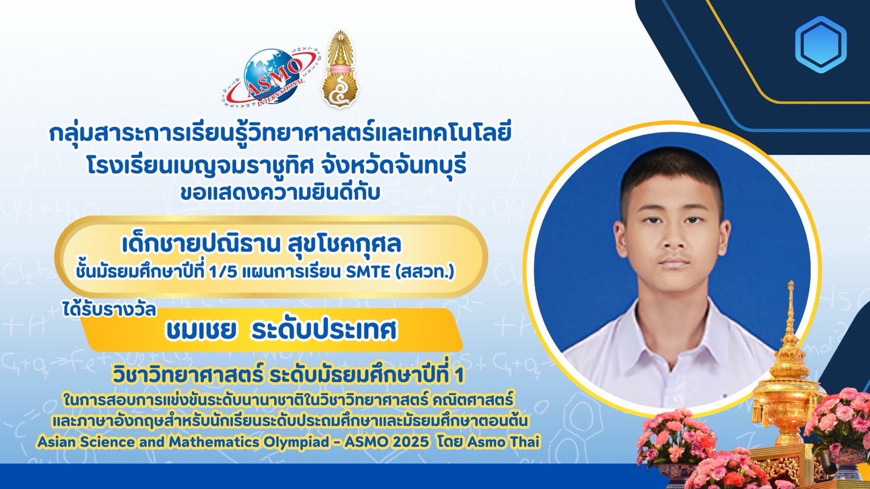 รางวัลชมเชย ระดับประเทศ (Commendation/Honorable Mention, National Level) การสอบแข่งขันวิชาการนานาชาติวิชาวิทยาศาสตร์ คณิตศาสตร์ และภาษาอังกฤษสำหรับนักเรียนระดับประถมศึกษาและมัธยมศึกษาตอนต้น (Asian Science and Mathematics Olympiad - ASMO 2025 โดย ASMO Thai