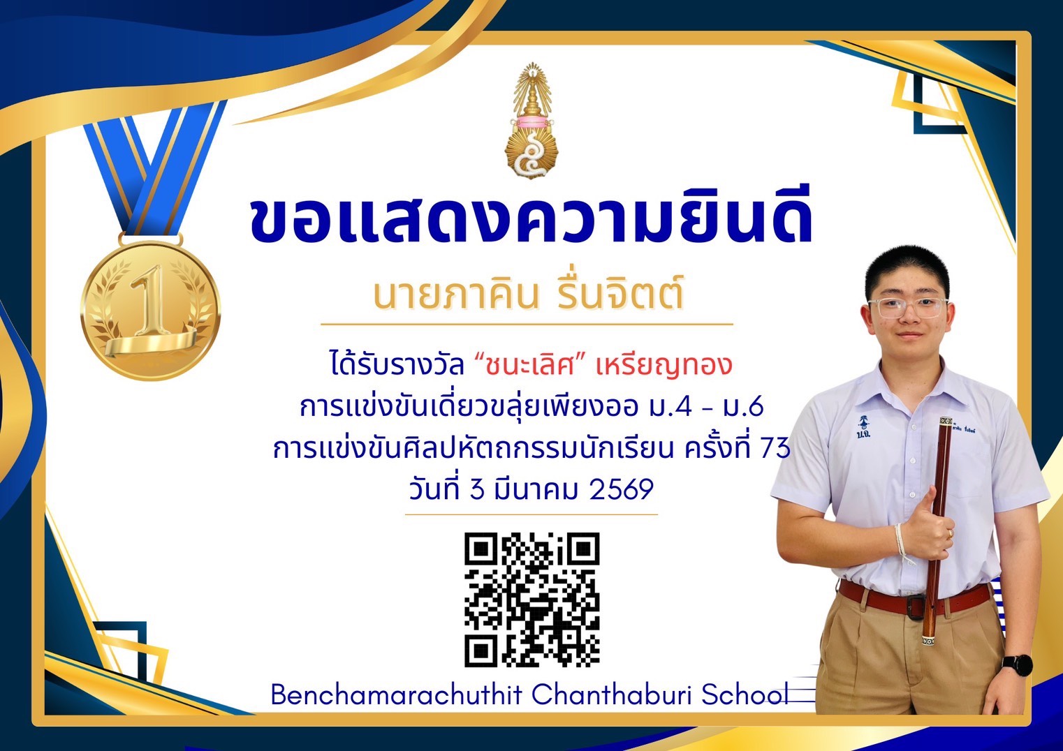 รางวัลชนะเลิศ เหรียญทอง การแข่งขันเดี่ยวขลุ่ยเพียงออ ม.4–ม.6 งานศิลปหัตถกรรมนักเรียน ครั้งที่ 73 ปีการศึกษา 2568