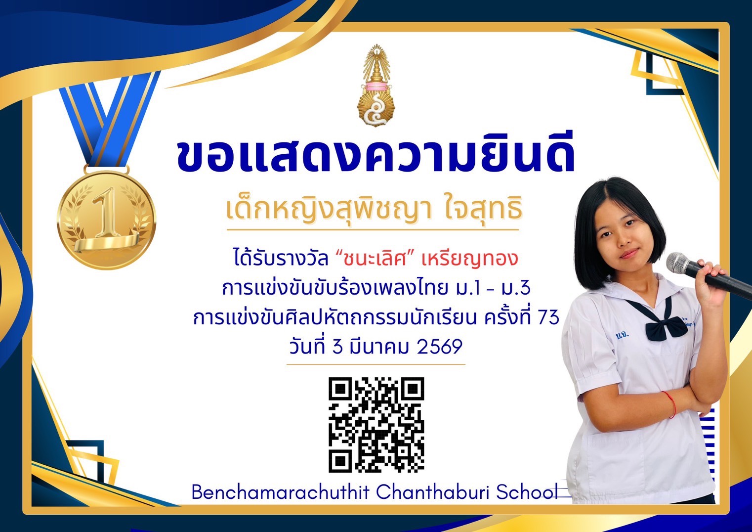 รางวัลชนะเลิศ เหรียญทอง การแข่งขันขับร้องเพลงไทย ม.1–ม.3 งานศิลปหัตถกรรมนักเรียน ครั้งที่ 73 ปีการศึกษา 2568