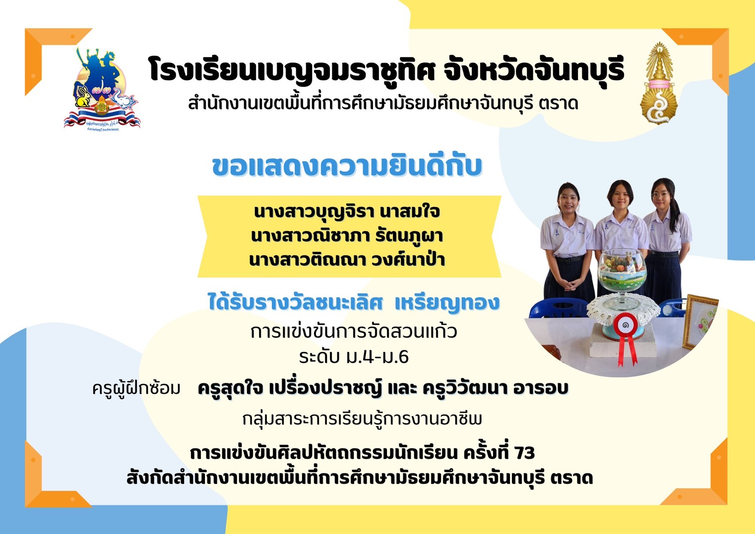 รางวัลชนะเลิศ เหรียญทอง การแข่งขันการจัดสวนแก้ว ระดับ ม.4–ม.6 งานศิลปหัตถกรรมนักเรียน ครั้งที่ 73 ปีการศึกษา 2568