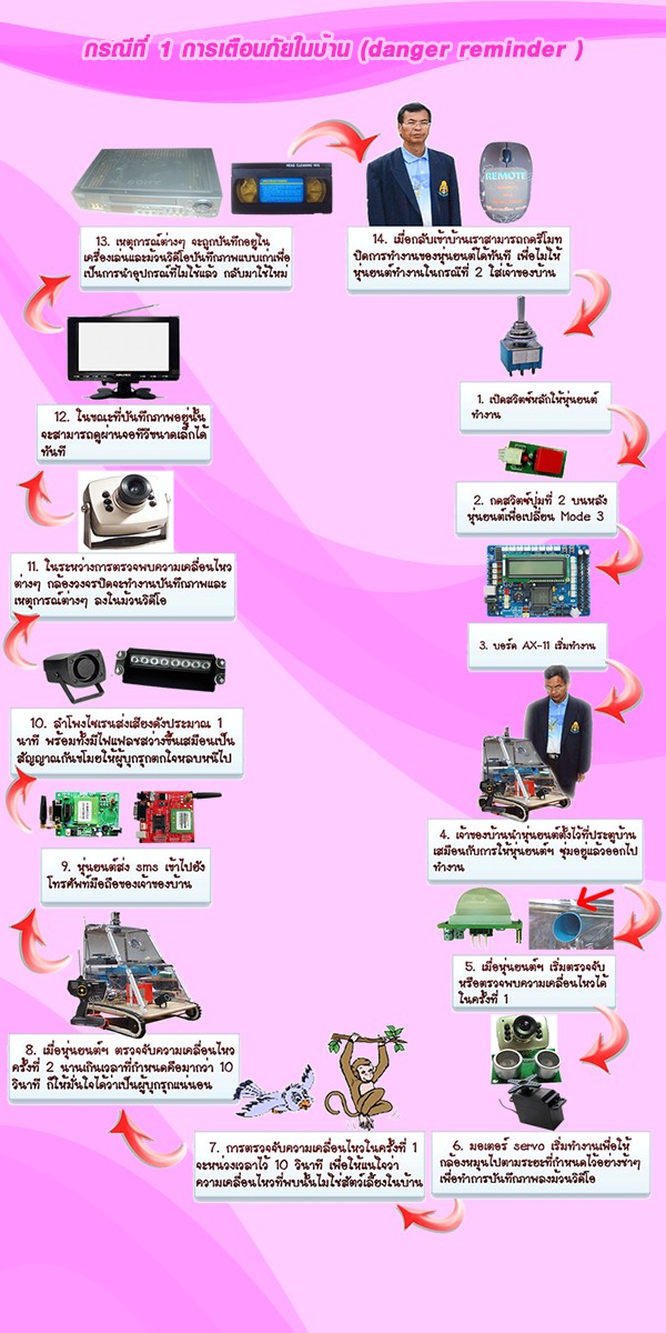 1. (1) เจ้าของบ้านได้เปิดสวิตซ์การทำงานของหุ่นยนต์ให้หุ่นยนต์เตรียมพร้อม เพื่อรับงานในหน้าที่ (2) สวิตซ์สีแดงบนหลังของหุ่นยนต์ จะมี 2 ปุ่ม เจ้าของบ้านต้องกดสวิตซ์ปุ่มที่ 2 บนหลังหุ่นยนต์เพื่อเปลี่ยนเป็น Mode 3 จะทำหน้าที่ของกรณีที่ 2 คือ เตือนภัยในบ้าน ซึ่งตามปกติบ้านบางหลังจะมีกล้องวงจรปิดสำหรับติดไว้เพื่อเก็บข้อมูลต่าง ๆ ตอนที่เจ้าของบ้านไม่อยู่ ดังนั้นถ้าในความเป็นจริง โจรไม่ได้เข้ามาในบริเวณแถวหน้าบ้าน ในส่วนนี้หุ่นยนต์จะไม่สามารถปฏิบัติภารกิจใด ๆ ได้อยู่แล้ว นั่นหมายความว่าต้องเป็นหน้าที่ของกล้องวงจรปิดที่เจ้าของบ้านนำมาติดไว้เพื่อเก็บภาพเท่านั้น